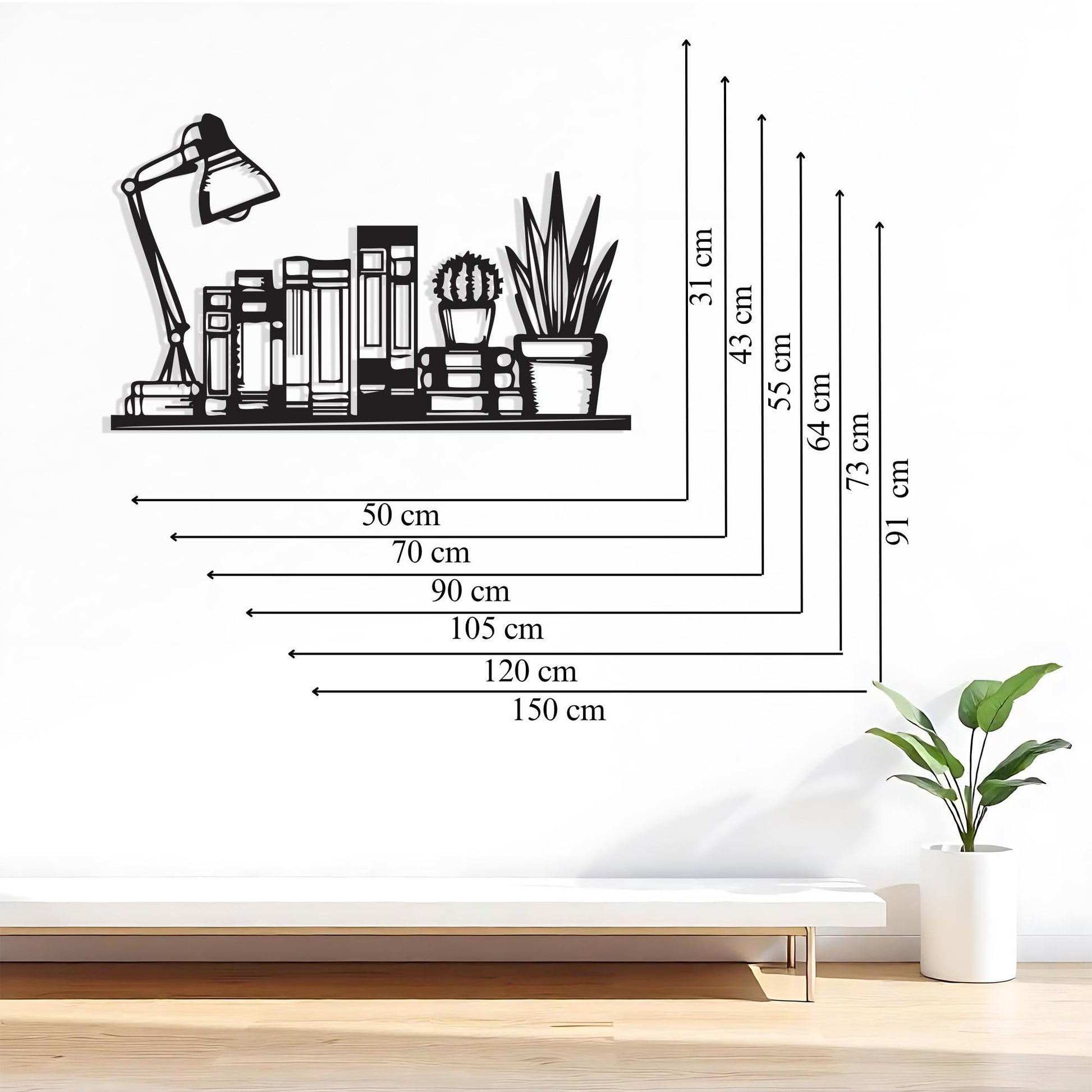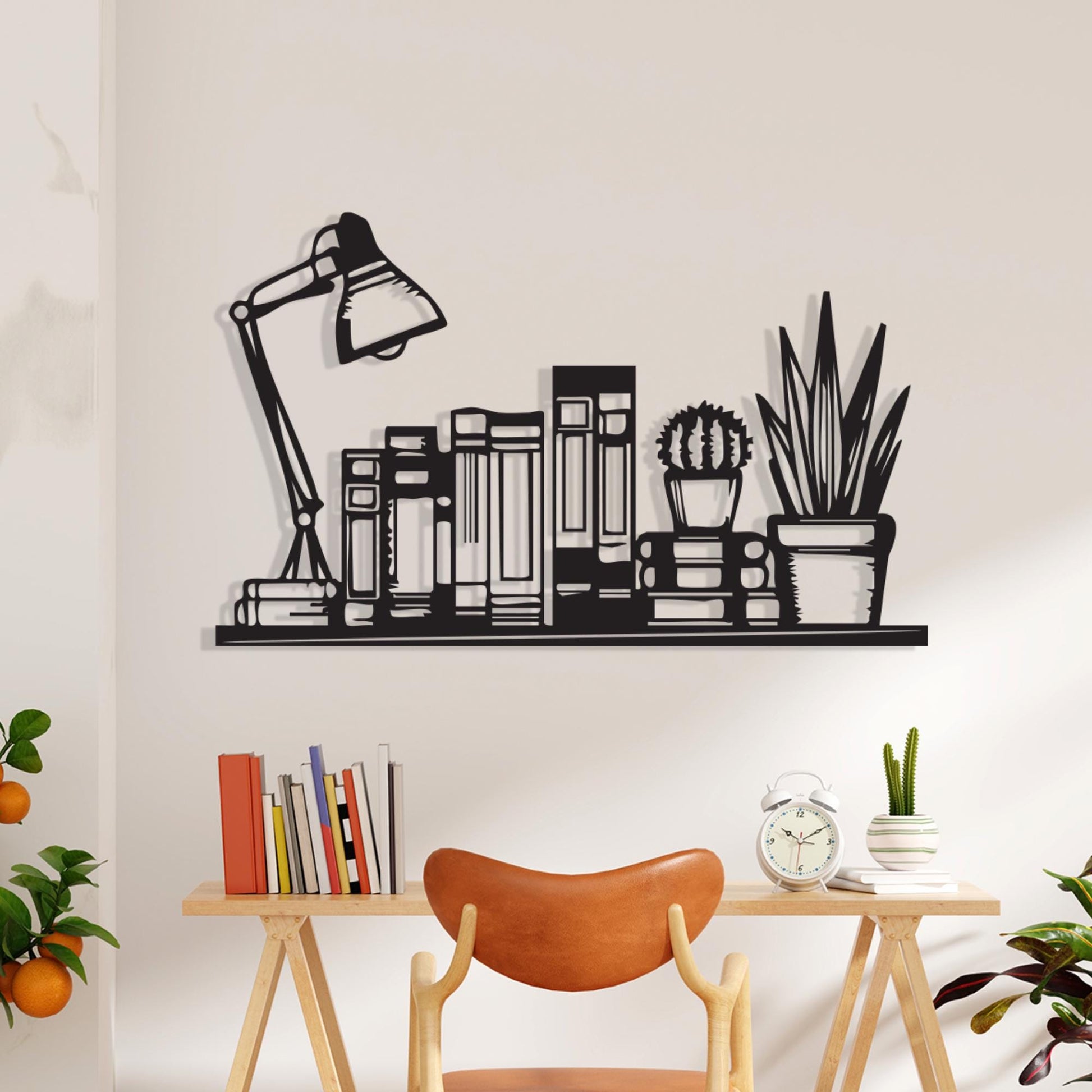 Add literary charm and modern elegance to your space with this stylish metal bookshelf wall art. Featuring books, a reading lamp, and potted plants, this black steel piece is ideal for book lovers and those who adore clean, cozy aesthetics. Perfect for your study, office, reading nook, or modern library.
