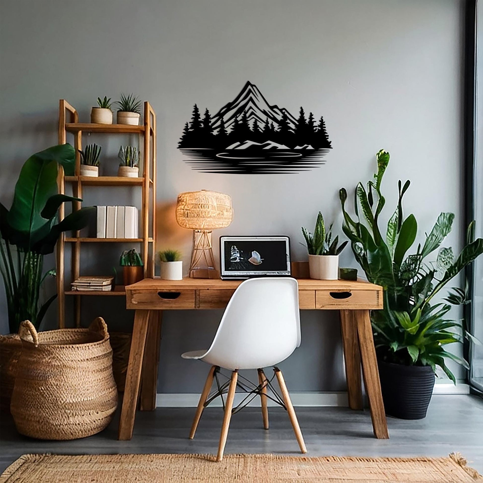Nature-inspired metal wall hanging featuring mountain peaks, trees, and lake reflection