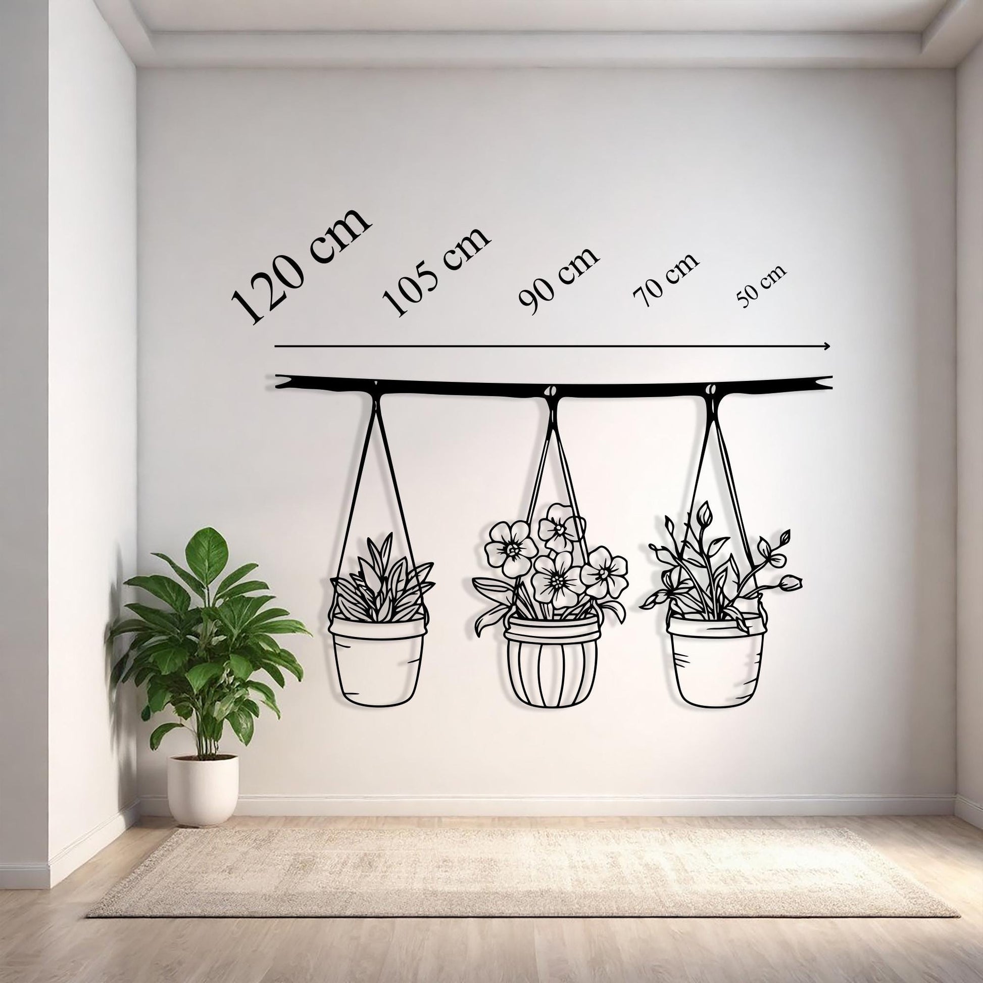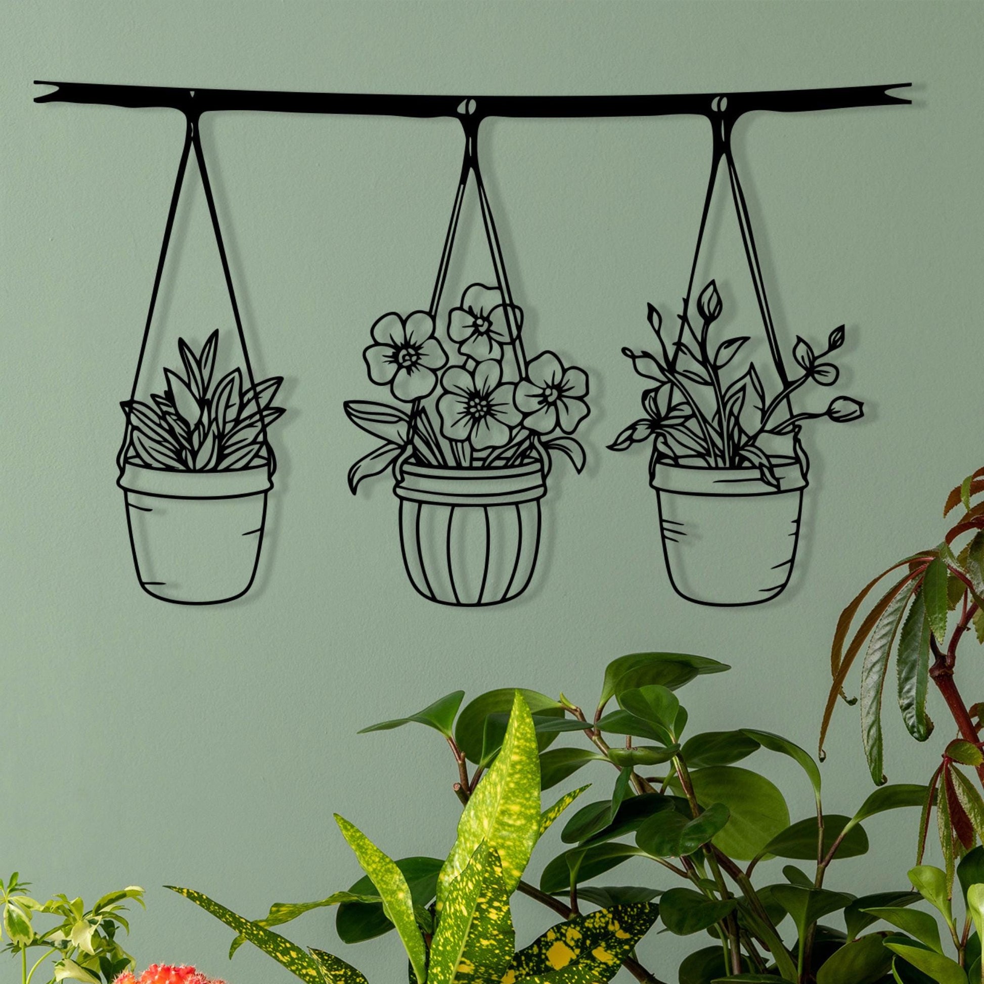 Bring the calming beauty of nature indoors with this metal hanging flower pots wall art. Featuring three intricately designed botanical planters suspended from a sleek line-art branch, this unique decor adds a fresh, botanical touch to kitchens, living rooms, or plant lover spaces.
