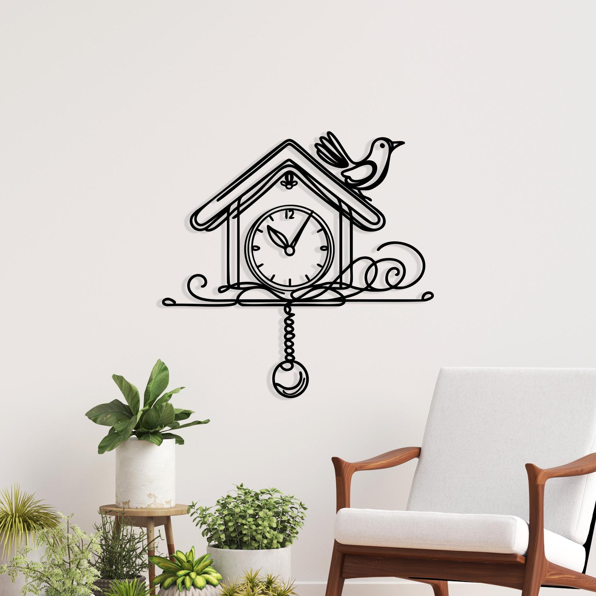 Features a minimalist cuckoo clock with perched bird and pendulum details