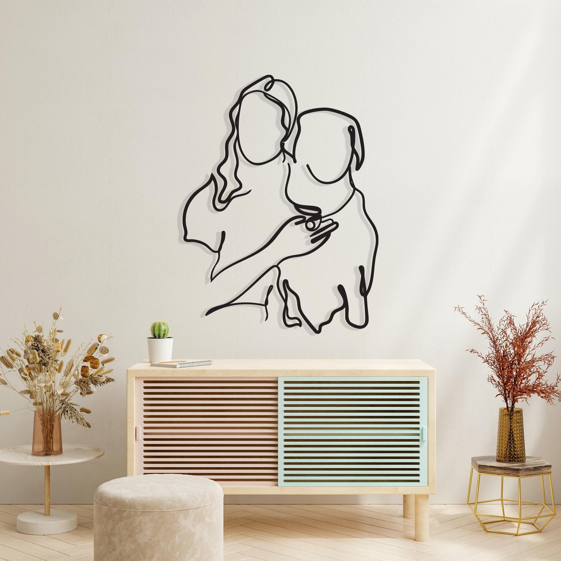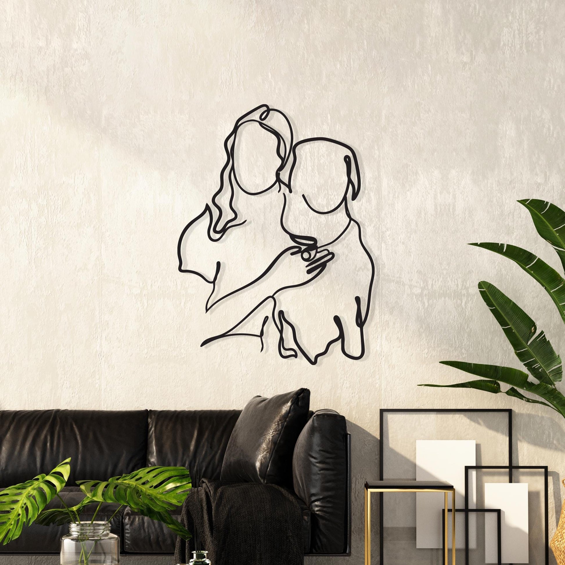 Celebrate the unconditional love of your best friend. Immortalize the special bond between you and your furry companion with this heartwarming Metal Dog Mom Wall Art. Featuring a beautiful, continuous line drawing of a woman embracing her dog, this piece captures the purest form of friendship and loyalty. It radiates warmth and affection, making it a perfect addition to your living room, bedroom, or entryway, constantly reminding you of the joy your pet brings to your life.