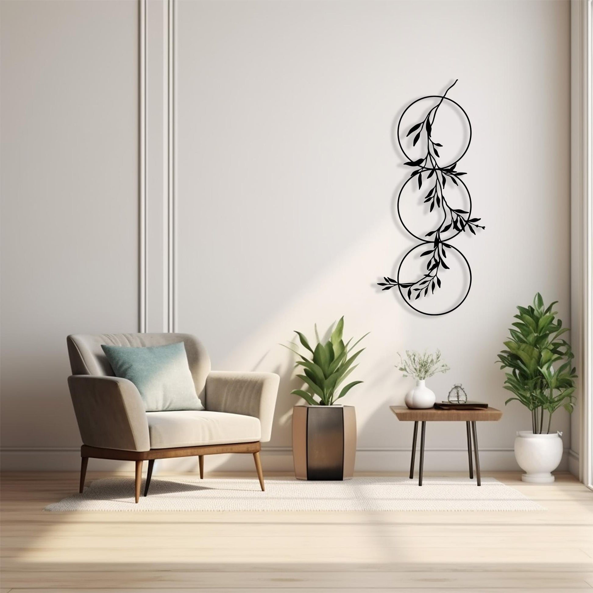 Add elegant height and nature to your walls. Enhance your vertical spaces with this exquisite Metal Vine Wall Art. Featuring delicate olive branches intertwining through three overlapping circles, this piece brings a harmonious blend of geometric modernity and organic beauty. It is specifically designed to transform narrow walls, columns, or the spaces between windows into captivating focal points without cluttering the room.