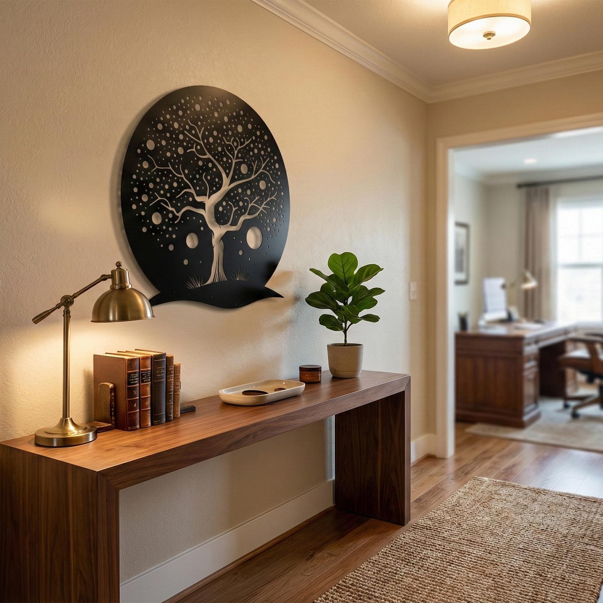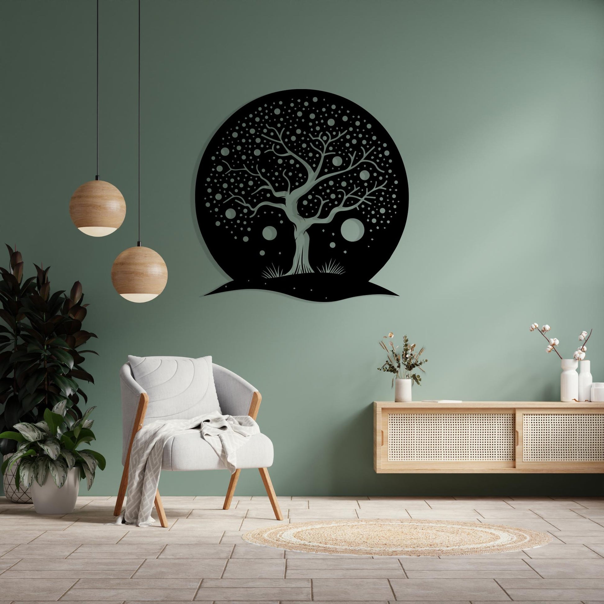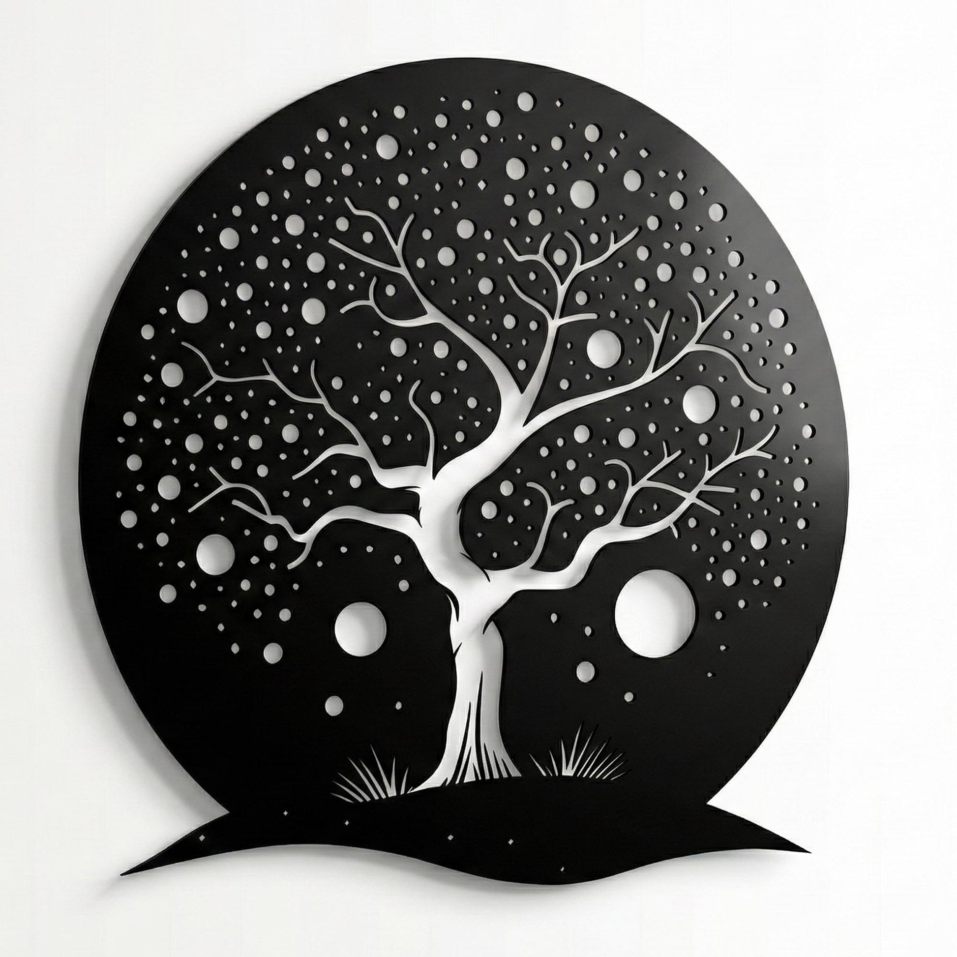 Artistic silhouette with lasting beauty. Expertly laser-cut from high-quality steel, this celestial tree design creates a stunning visual impact. Finished with a durable matte black powder coating, it stands out beautifully against light-colored walls and is resistant to rust. The artwork is designed to be mounted slightly away from the wall, allowing light to pass through the open spaces and creating dynamic shadows that add depth and a 3D effect to the scenery.